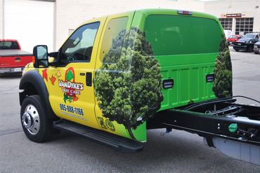 Black Chevrolet truck with green and orange tree care decals and rugged tires.